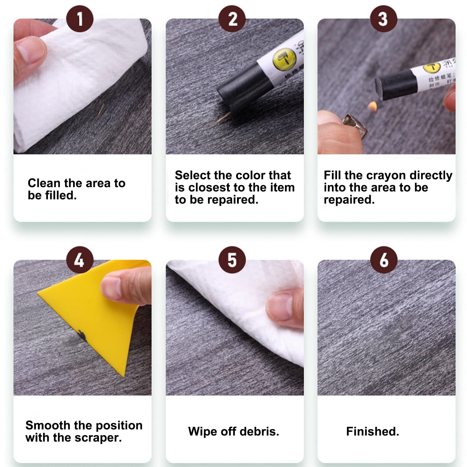 - Repair Method for Crack or Hole: Use a lighter to melt the crayon into the hole or crack. After the liquid has solidified, scrape it with the scraper. You can also watch the video on the product details page for specific steps.