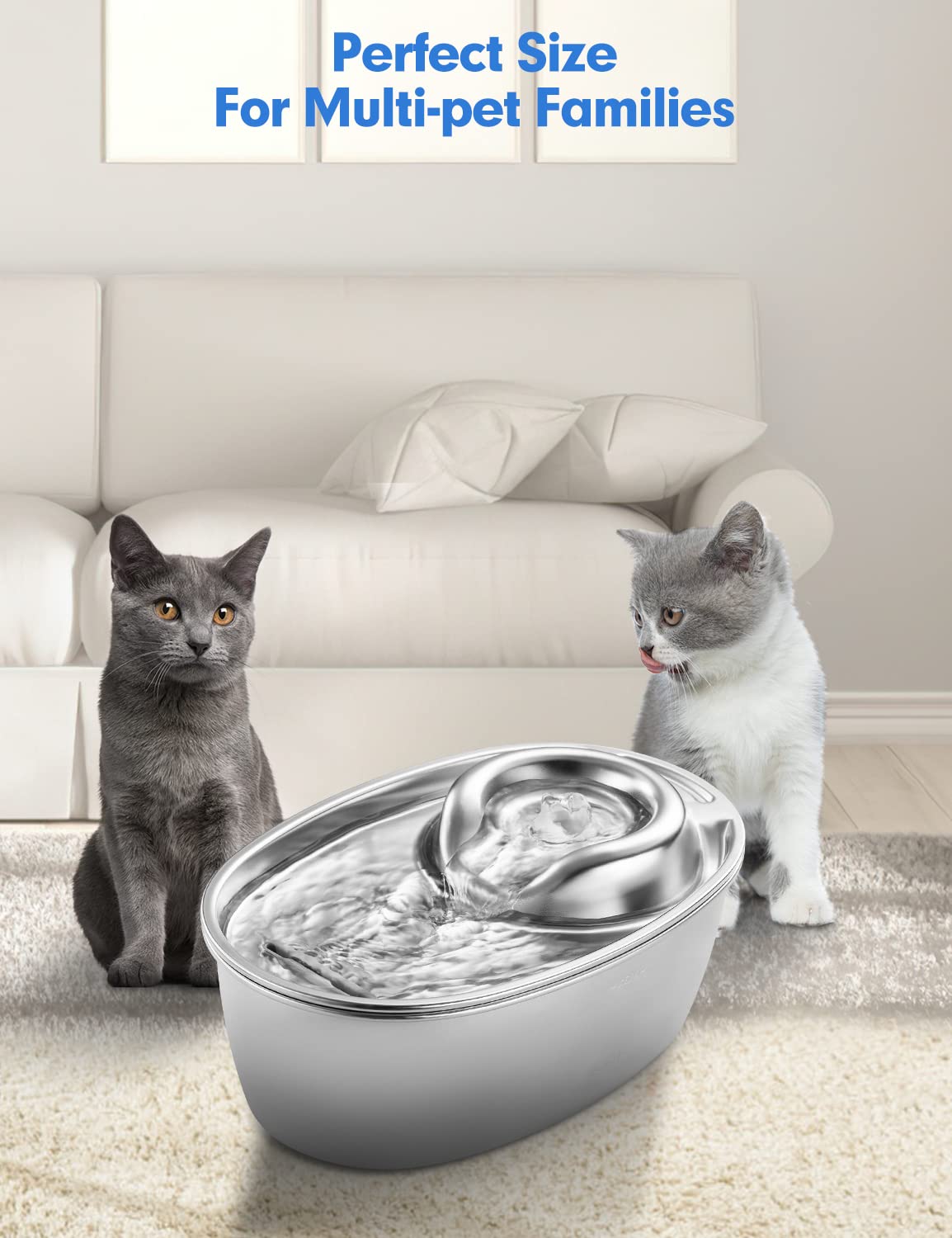 - ULTRA QUIET OPERATION:Water flows gently over the tower of the stainless steel cat water fountain, allowing timid or shy cats to drink in comfort. Ultra-quiet submersible pump for quiet operation.