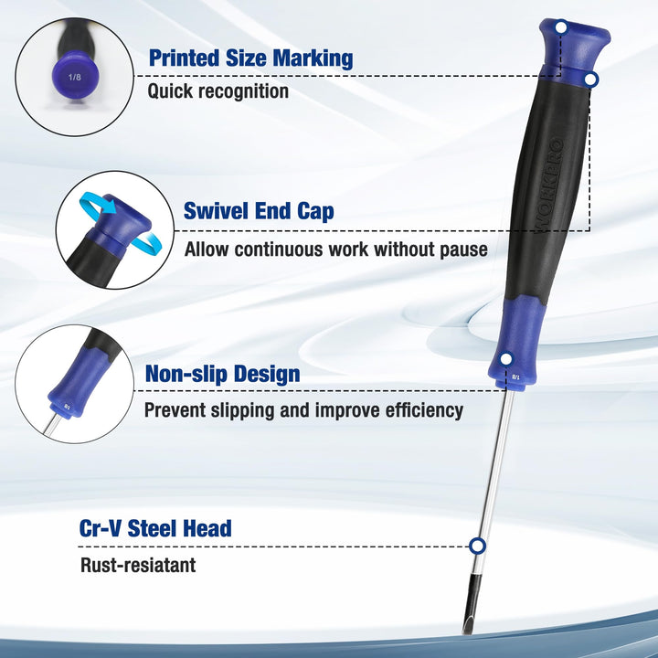 - NON-SLIP HANDLE: The swivel end cap of the precision magnetic screwdriver allows constant finger pressure while driving, and the non-slip PP+TPR grip offers maximum turning power; The precision screwdriver's size is indicated on the end cap, making it easy to identify the right screwdriver for the job