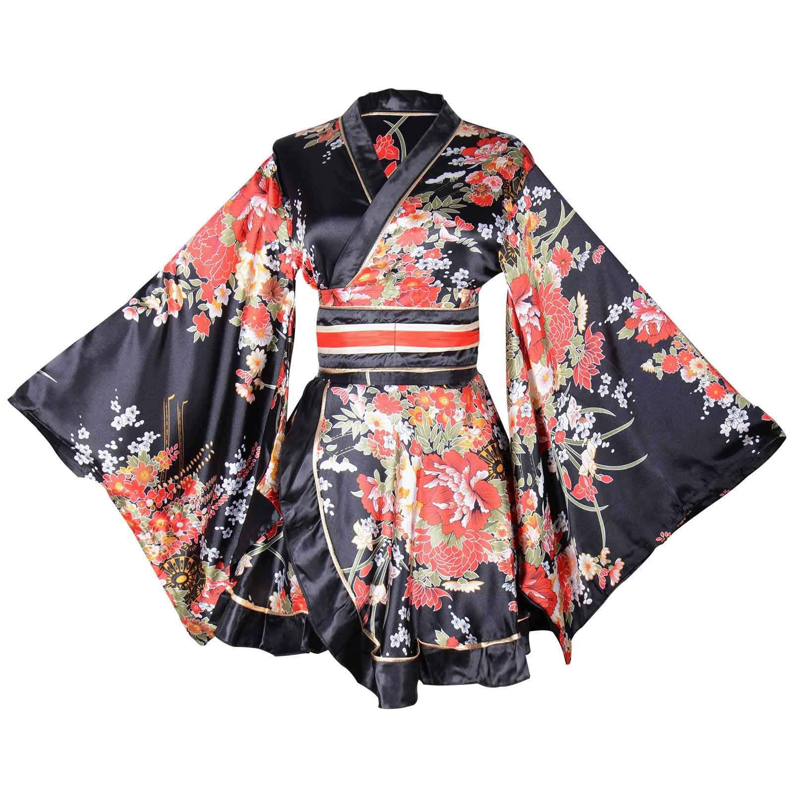 - Original Costumes – Asian Size Sexy Short Kimono Costume Adult Women's Japanese Geisha Yukata Prints Gown Blossom Fancy Dress With Obi Belt Fit Bust 44 (Black) by Wraith of East