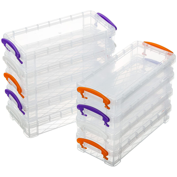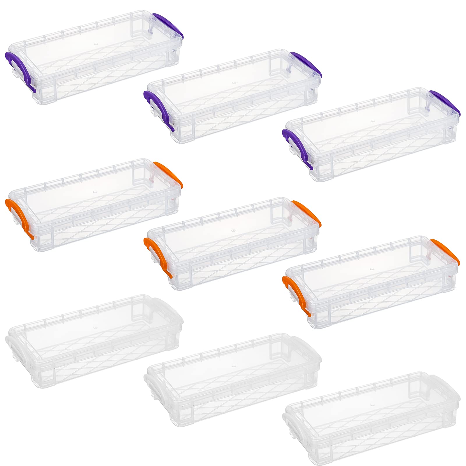 - Package Includes 9 pack translucent plastic pencil box with white, orange and purple locking clips (3 pack of each color), meet your requirement for various purpose. The dimensions of plastic pencil box measures 8.5x 4x 1.6, large enough to hold many pencils and pens. Suitable for children over three years old.