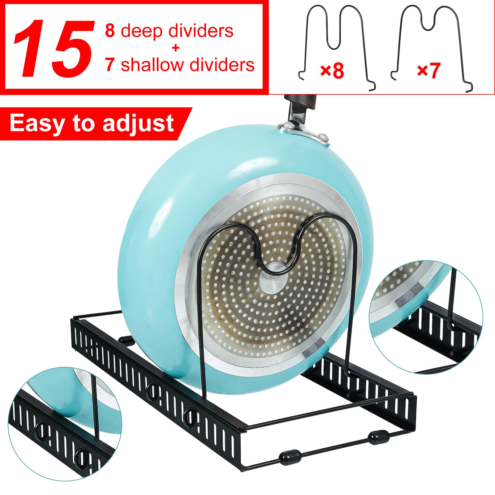 - {8 Deep+ 7 Shallow Adjustable Dividers}: The pot lid holder comes with 15 adjustable dividers. Easy to change the size of spaces. The 8 deep dividers will fit small pat lids, at he same time, 7 shallow dividers will fit big lids. Give large capacity to storage pots, pans,lids, bakewares, cupboards and cookwares.