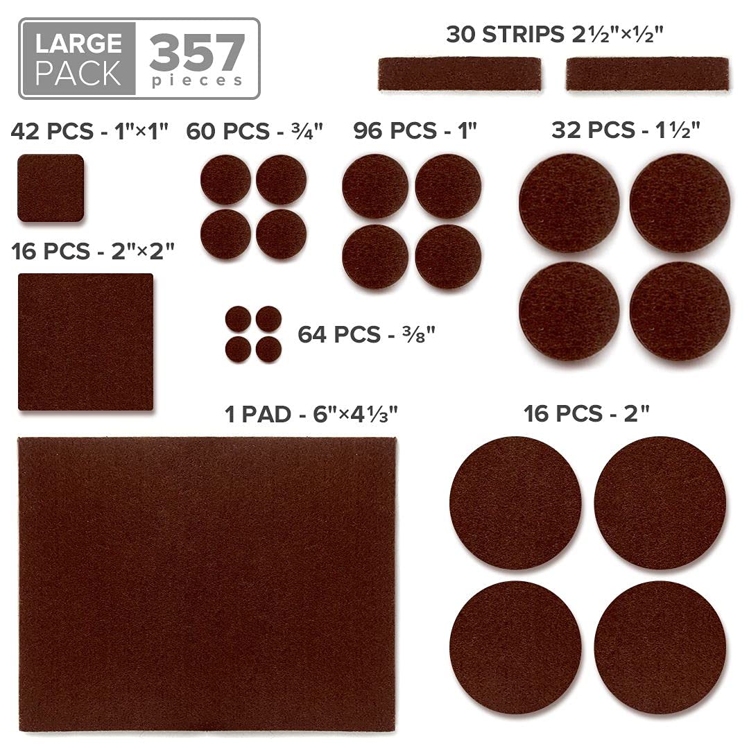 - HUGE QUANTITY OF FURNITURE PADS FOR ALL YOUR NEEDS - ALL SIZES AND MANY BIG FELT PADS - 357 pieces: (1) 4 1/3x6”, (30) 2½x½”, (16) 2”, (16) 2”x2”, (32) 1 ½, (42) 1”x1”, (96) 1”, (60) ¾”, (64) 3/8”.