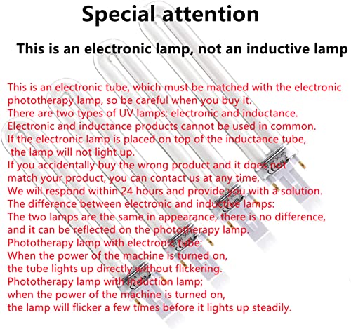- Note: This is an electronic tube, which must be matched with the electronic phototherapy lamp, so be careful when you buy it. There are two types of UV lamps: electronic and inductance. Electronic and inductance products cannot be used in common. If the electronic lamp is placed on top of the inductance tube, the lamp will not light up.
