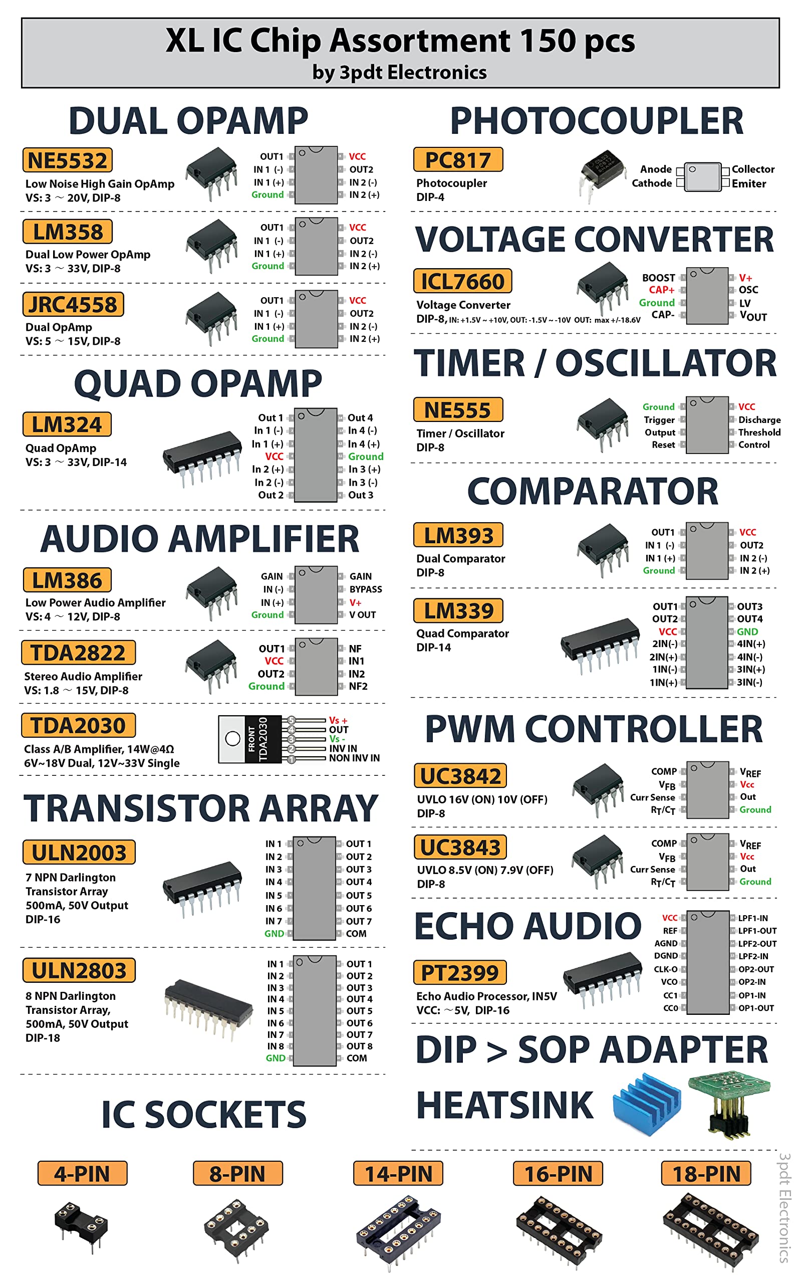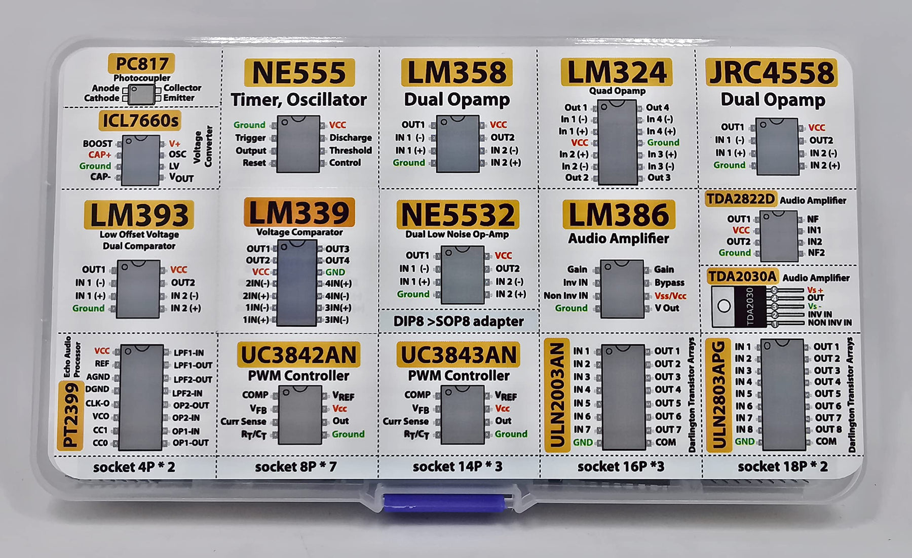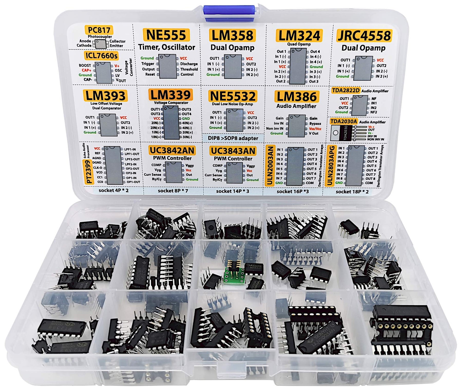 - Original Communication Integrated Circuits – XL IC Chip Assortment 150 pcs, opamp, oscillator, pwm, PC817, NE555, LM358, LM324, JRC4558, LM393, LM339, NE5532, LM386, TDA2030, TDA2822, PT2399, UC3842, UC3843, ULN2003, ULN2803, 7660, Sockets by 3pdt