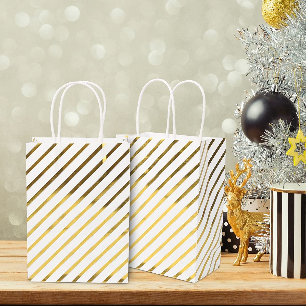 - Original Gift Bags – 24 Pack Paper Gift Bags Party Favor Bags Recyclable Goodie Bags for Birthdays, Weddings, Baby Showers,Shopping.Gold Foil Stars Design, White(15 * 21 * 8cm) (Gold Foil Stripe) by XNX