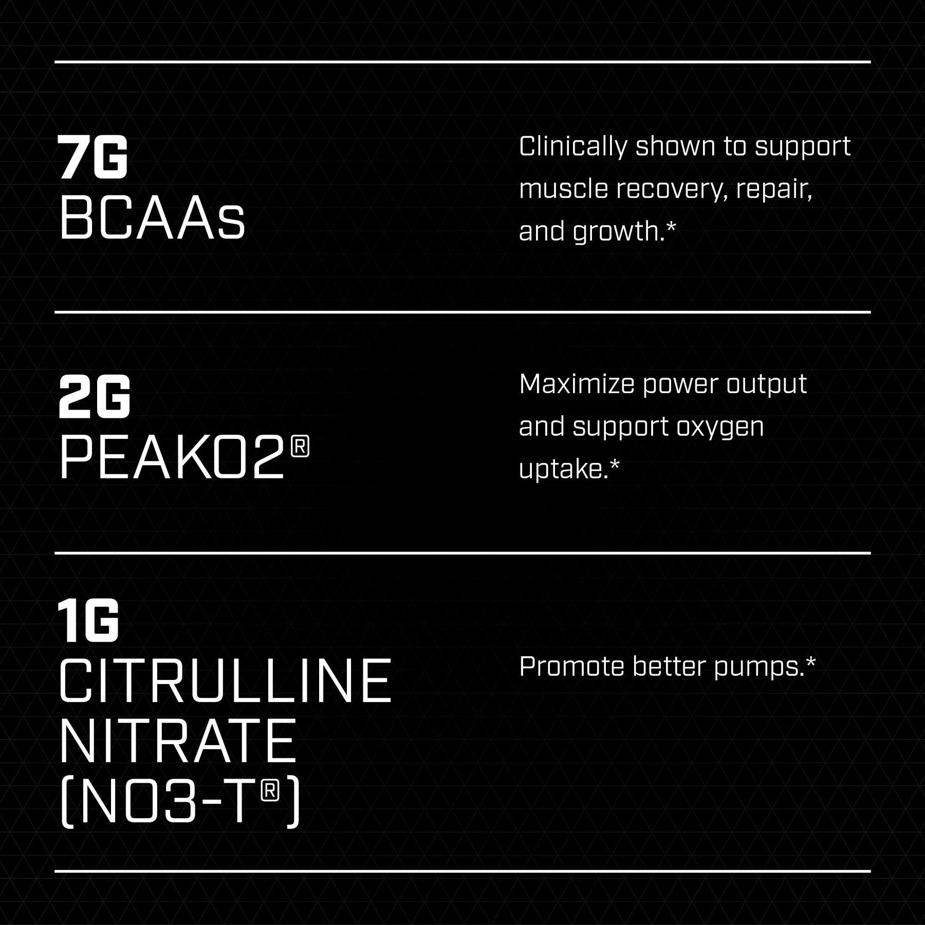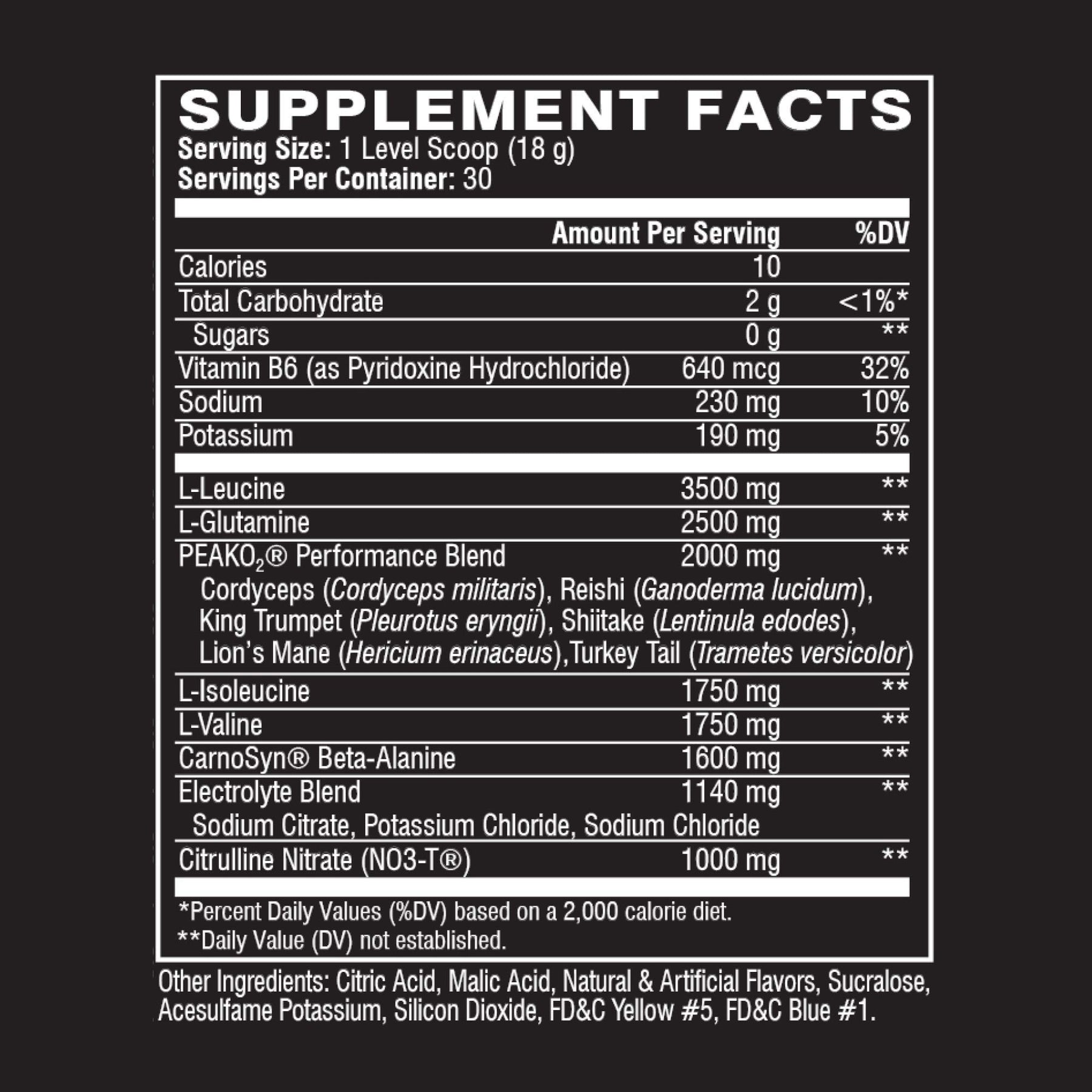 ingredients | L-Leucine (3.5g), L-Glutamine (2.5g), Peak O2® Performance Blend (2g) (Cordyceps (Cordyceps militaris), Reishi (Ganoderma lucidum), King Trumpet (Pleurotus eryngii), Shiitake (Lentinula edodes), Lion's Mane (Hericium erinaceus), Turkey Tail (Trametes versicolor)), L-Isoleucine (1.75g), L-Valine (1.75g), CarnoSyn® Beta-Alanine (1.6g), Electrolyte Blend (1.14g) (Sodium Citrate, Potassium Chloride, Sodium Chloride), Citrulline Nitrate (NO3-T®) (1g). Other ingredients: Citric Acid, Malic Acid, Natural & Artificial Flavors, Sucralose, Acesulfame Potassium, Silicon Dioxide, FD&C Yellow #5, FD&C Blue #1 |