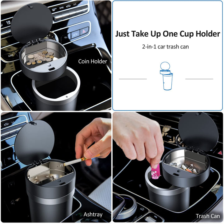 - 2 in 1, Just Occupy One Cup Holder: Car Cup Holder Trash Can, double space inside. It can act as a mini car trash can and car ashtray at the same time, or it can be a small object organizer or car coin holder . The 2 in 1 car cupholder trashcan is a road trip essentials for adults.
