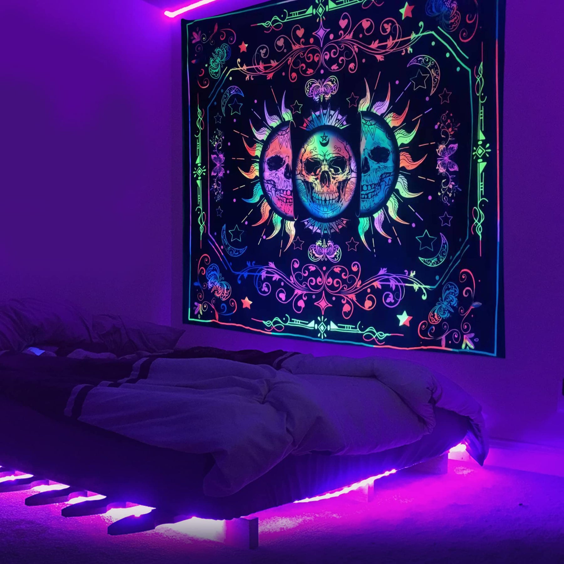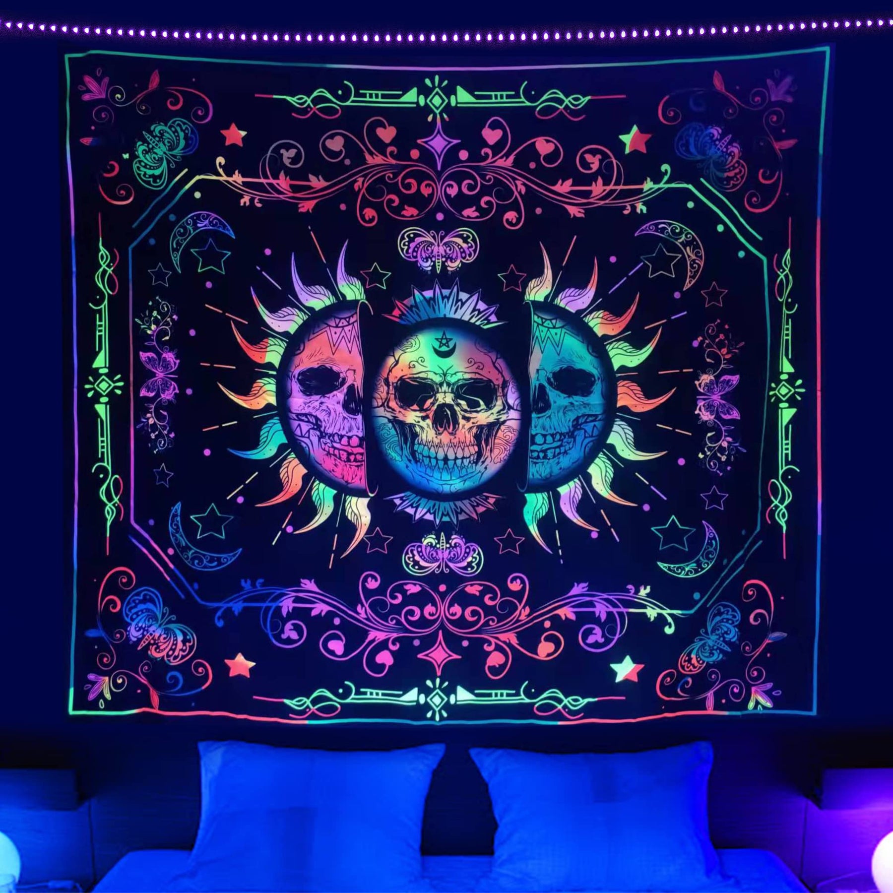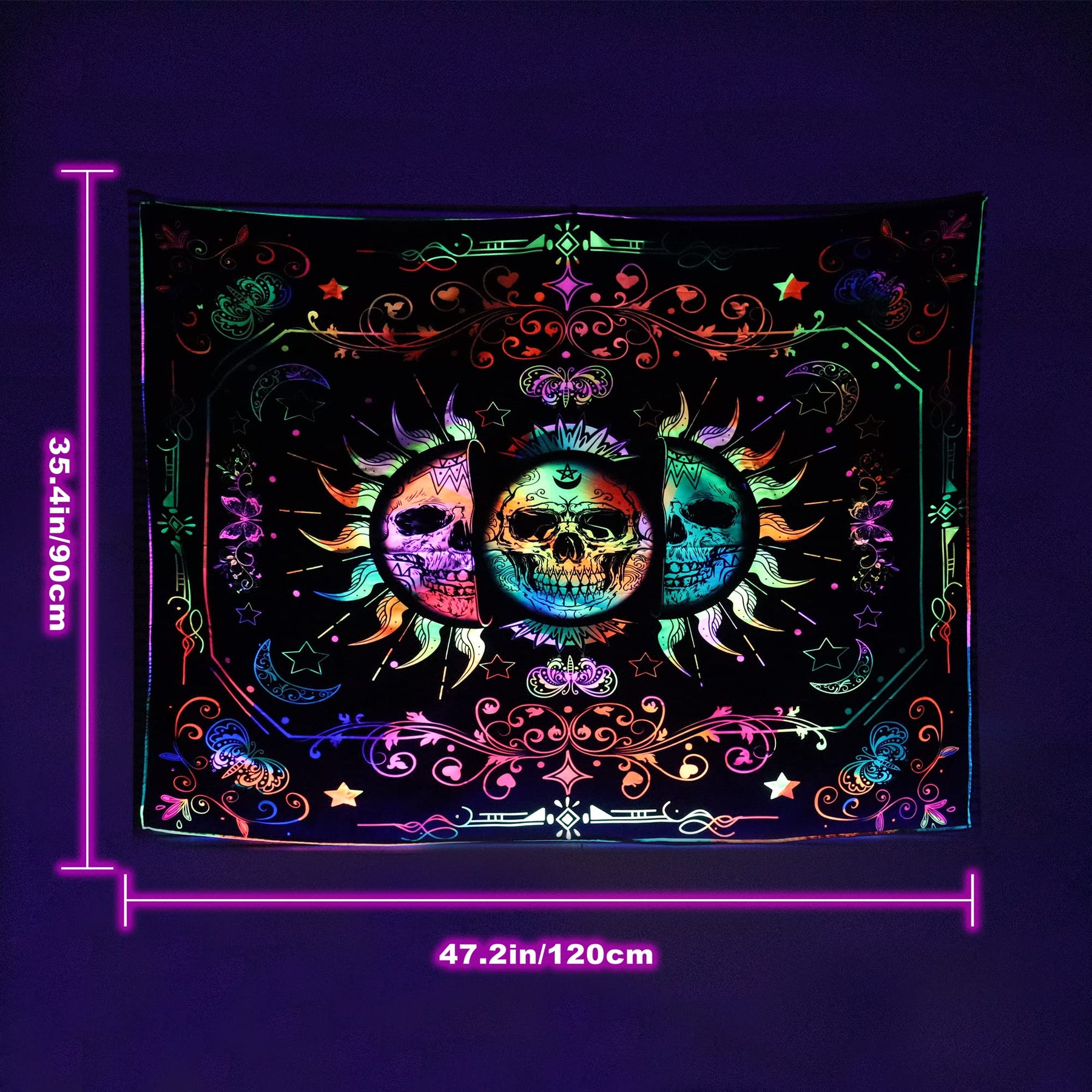 - Original Tapestries – Blacklight Trippy Sun and Moon Stars Tapestry UV Reactive Skull Tapestry Wall Hanging psychedelic Black light Skeleton Tapestries for bedroom aesthetics Party Decor Poster 35.4 * 47.2inch by Yagizaul
