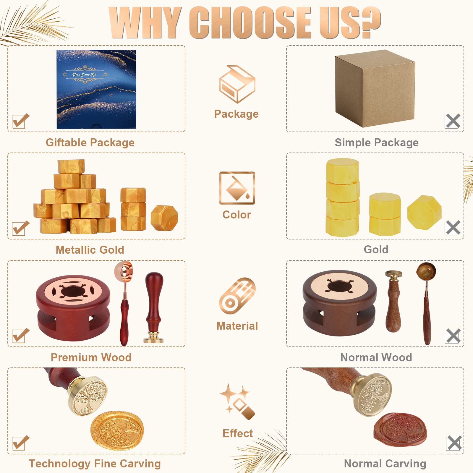 Yagugu sealing wax kit includes a complete set of tools for making wax seals, which includes 350pcs mini sealing wax beads, 1 pcs tree of life wax seal stamp, stove and spoon, and 4 pcs tea candles. If add floral or leaves, your envelops or gift packaging will looks more special and elegance.