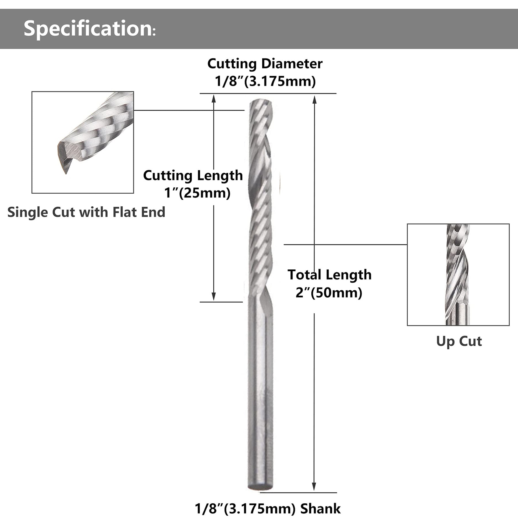 - Type: Spiral (Upcut), Cutting Type: Single Flute with Flat End, Shank: 1/8 (3.175mm), Cutting Diameter: 1/8 (3.175mm), Cutting Length: 1 (25mm), Overall Length: 2 (50mm)