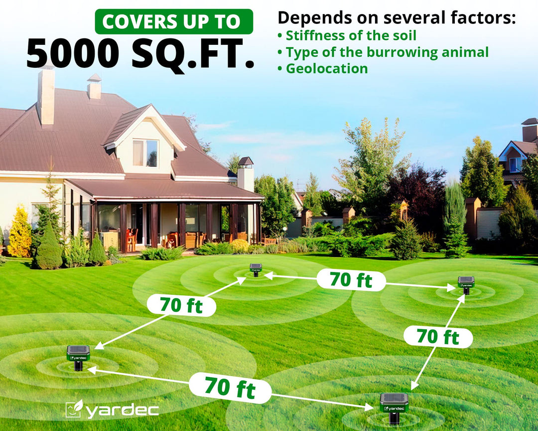 - 2024 Solution For Rodent-free Yard- Our Mole Repellent Solar Powered protects your yard and garden from all burrowing rodents such as moles, voles, gophers, groundhogs, snakes, etc. This solar powered pest & rodent repeller emits 2-3 seconds sonic pulses and vibrations in the ground every 30 seconds and scares them away.