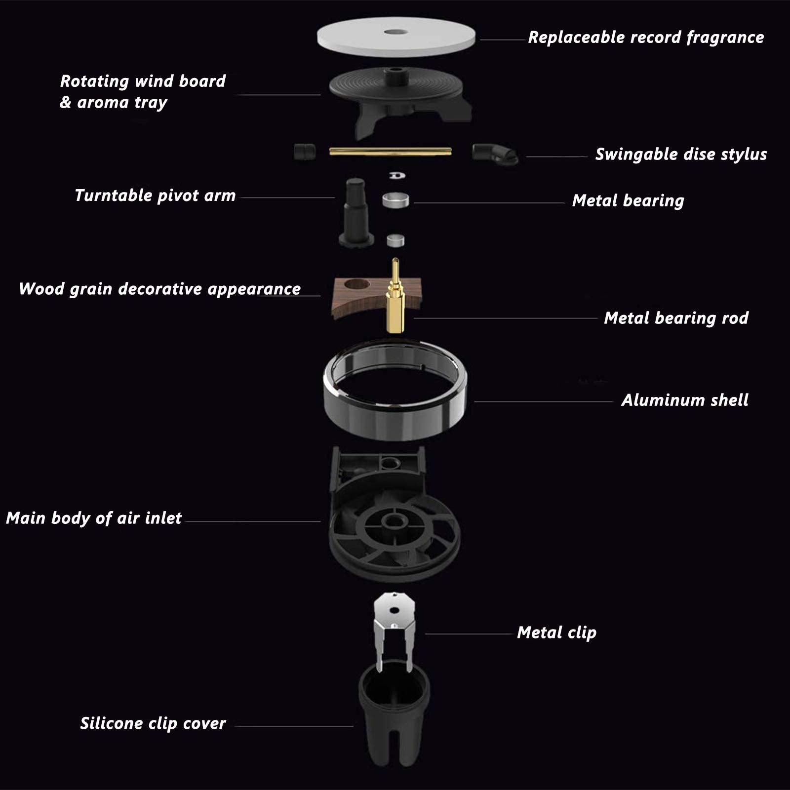 - Retro Record Player Car Decorair freshener for car is in record-player disc design, the aroma album can rotate with the air conditioning wind, bringing fragrance. Retro wood design, gold magnetic head, texture base, vinyl record, take you back to the era of record player.
