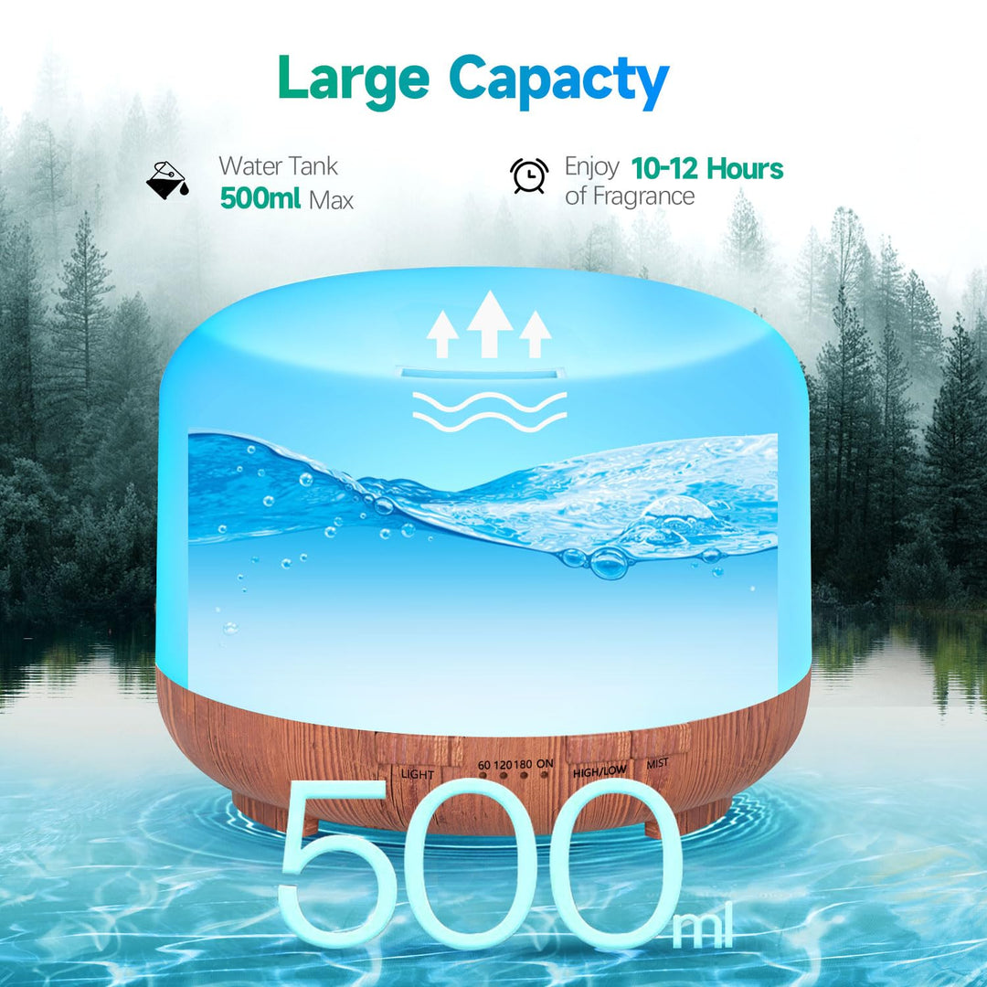 - 500ml Diffuser, Included 6x10mL oilsOur essential oil diffuser come with top-fill design allow easier filling and cleaning, just open the lid, 6 bottles of pure essential oils are packaged in the aromatherapy diffuser.