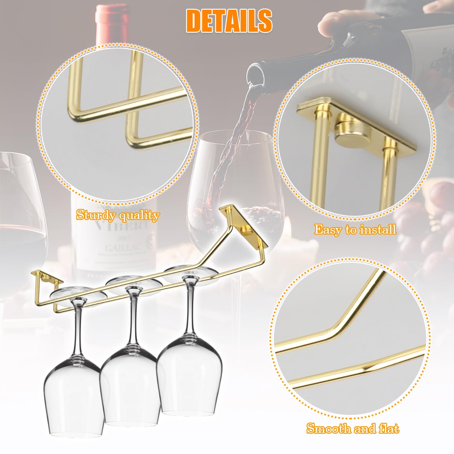 - Elegant Design: Made of sturdy steel and polished, this stemware holder is sturdy and durable, with a hanging design that makes efficient use of the space under your kitchen cabinets, and keeps your wine glasses safely stored. A modern minimalist wrought iron style that works with a variety of styles and adds a touch of elegance to your kitchen or bar decor.