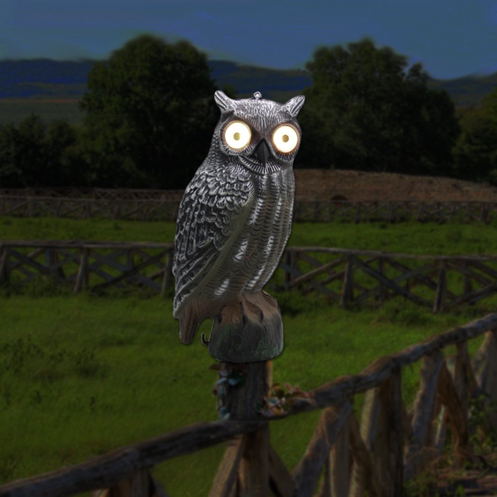 - Solar powered -- the scarecrow automatically absorbs solar energy through solar panels, at night the owl's eyes will be light automatically to keep birds, squirrels, and other destructive living beings away.