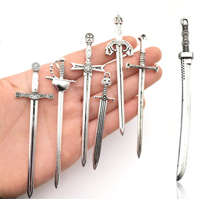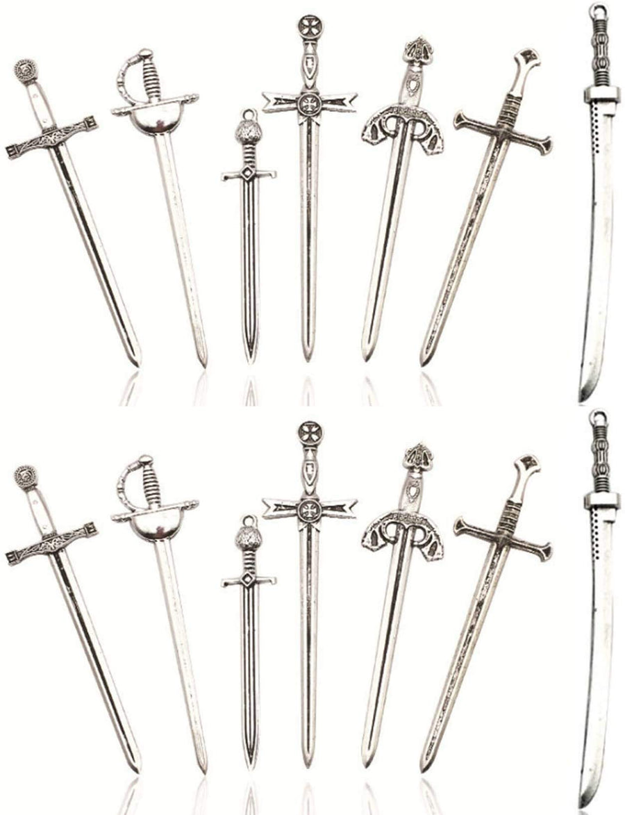 - 14pcs (7 styles) Craft Supplies Antique Silver Long Swords Knife Bookmark Charms Pendants for Crafting, Jewelry Findings Making Accessory for DIY Necklace (14pcs Long knife charms silver)