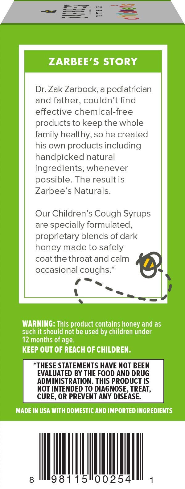 - Safe and Effective: Our cough formula, recommended for kids 12 months plus, is free of drugs, alcohol, dyes, gluten and artificial flavors. Zarbee's Children's Cough Syrup plus Mucus w/natural dark honey and natural grape flavor is a cough syrup