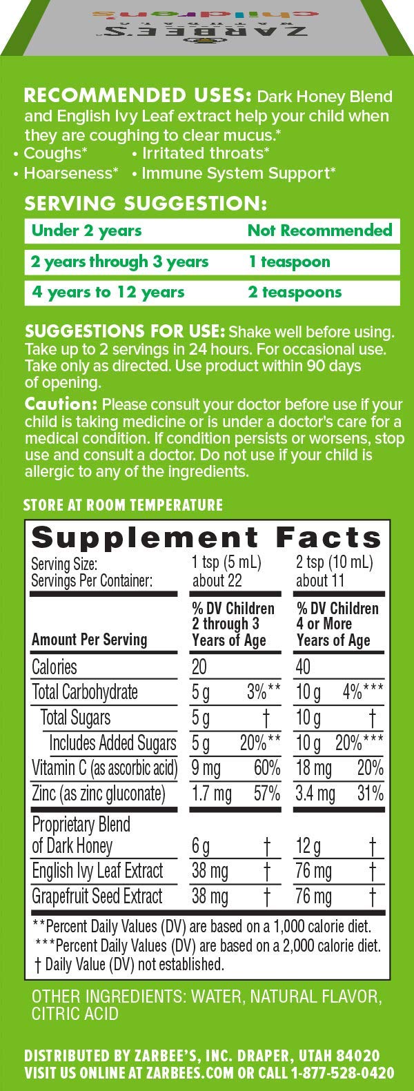 - Turn Coughs Into Giggles: Zarbee's Children's Cough Syrup plus Mucus with Dark Honey and Ivy Leaf extract helps your child when they are coughing to clear mucus. Our formula is made with English ivy leaf extract, vitamin C, zinc and natural dark honey