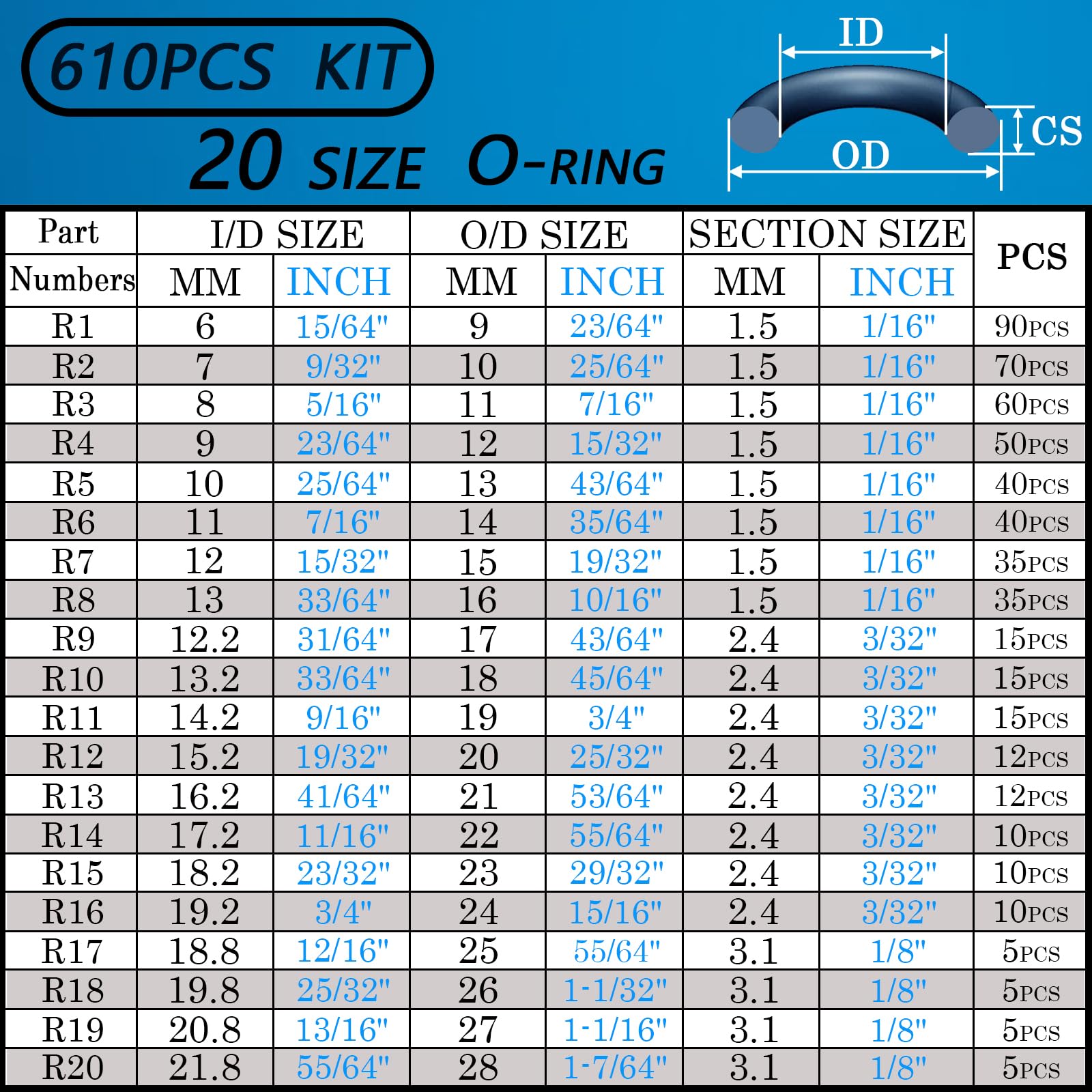 - {O RING SIZE}: O ring kits 20 size OD:9mm,10mm,11mm, 12mm, 13mm, 14mm, 15mm, 16mm, 17mm, 18mm, 19mm, 20mm, 21mm, 22mm, 23mm, 24mm, 25mm, 26mm, 27mm, 28mm