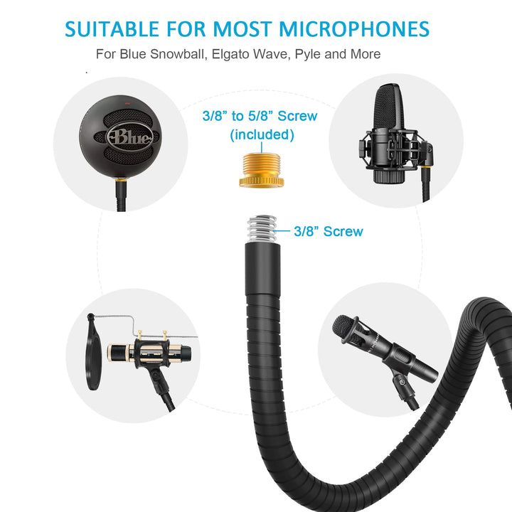 - Broad Compatibility(LOAD BEARING: 2.2lbs) With a length of 19 inches, this microphone arm stand allows you to adjust your microphone to the perfect position with its flexible gooseneck arm. The microphone clip holder has a maximum diameter of 1.38 inches, making it compatible with a variety of standard handheld mics. The included 3/8 to 5/8 screw adapter is specifically designed to work seamlessly with Blue Snowball, HyperX SoloCast and other microphones.