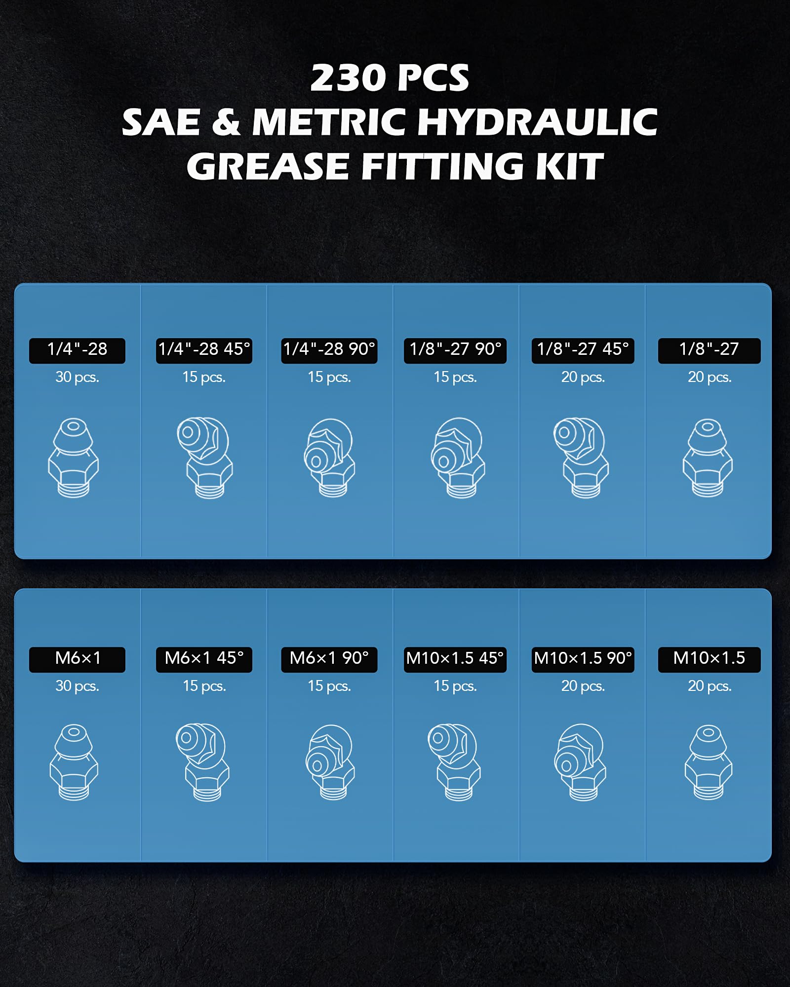 - ALL-IN-ONE SET: ZELCAN's 230-piece grease fitting set includes twelve types of the most commonly used SAE and metric grease fittings to feed lubricant to your bearings and other mechanical devices without need for disassembly