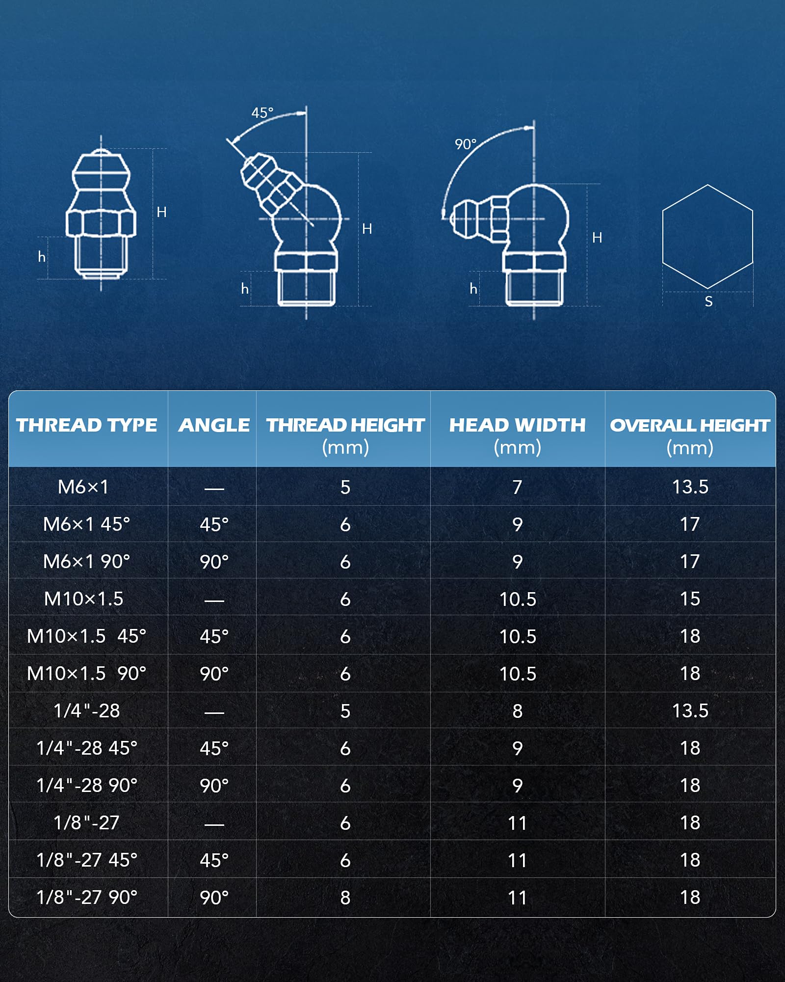 - STRAIGHT & ANGLED FITTINGS: Perfect for automotive and industrial use, these 1/4, 1/8, M6, and M10 grease fittings come with straight, 45°, and 90° heads to get your lube injected just where you need it however tight the space
