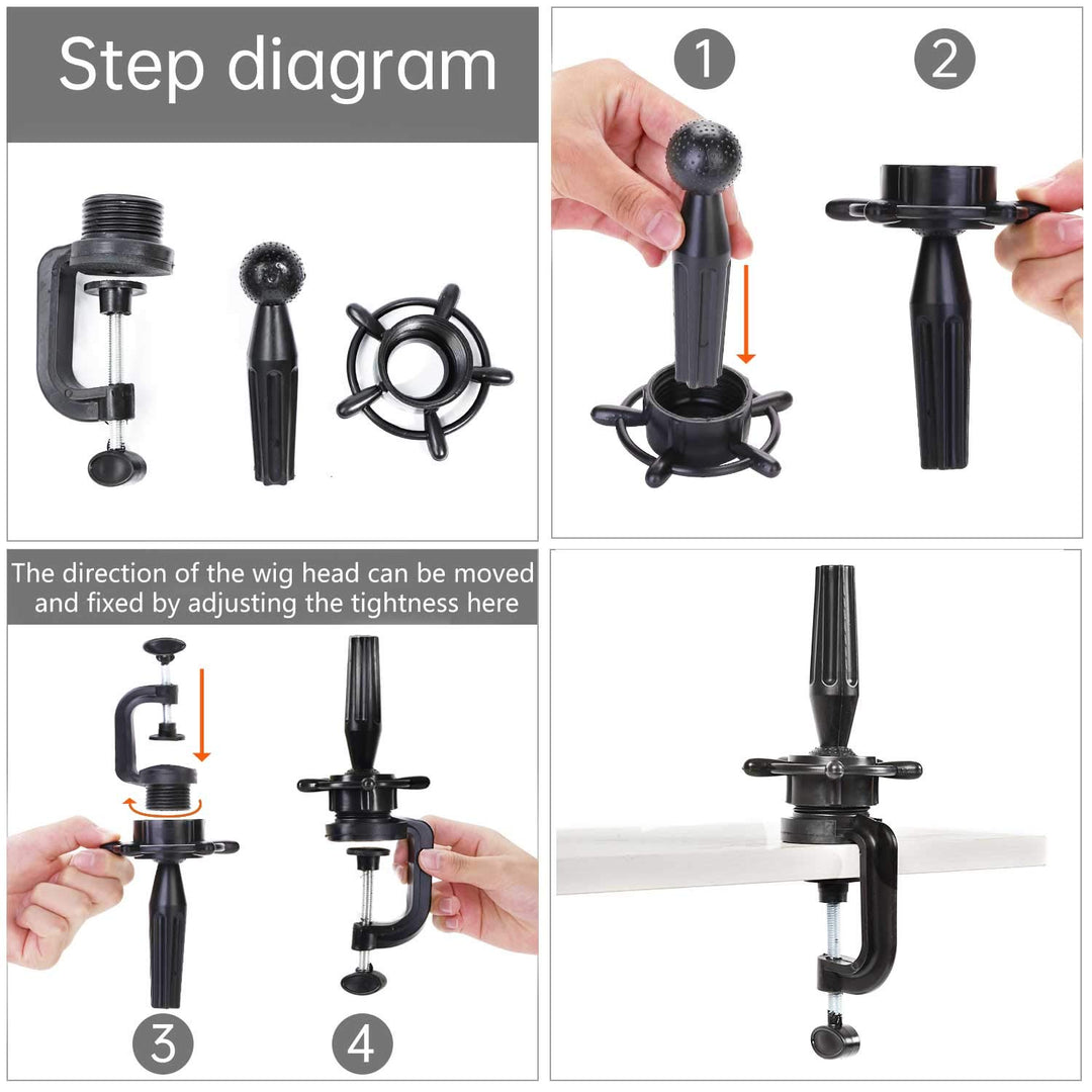 - [ HEAD INSTALLATION ]: The wig head base has mounting holes (about 1 inch in diameter) that match most wig stands or tripods on the market. The clamp stand is included in the package, please refer to the steps shown in the picture to install the clamp stand.