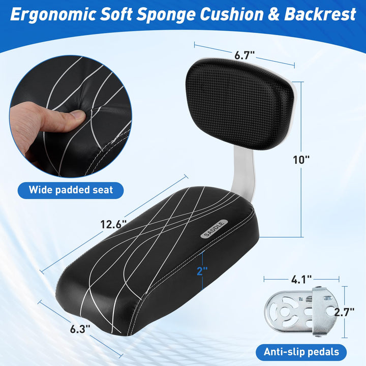 - DIMENSIONS: cushion 13×6×2 in, backrest 6.7×4.3×1.5 in, armrest 9×7 in, footrest 4.25×2.4 in, please check the dimension of your biycle before ordering
