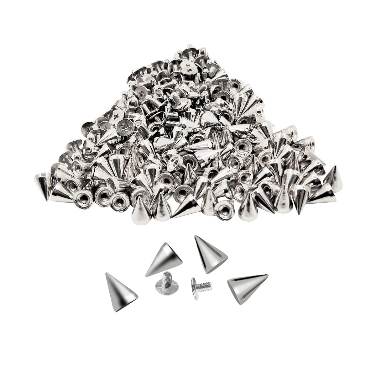 - PACKAGE INCLUDE: 100 sets cone spikes studs with screw. COLOR: Silver. Size: 0.38inch x 0.28inch (10mm x 7mm )