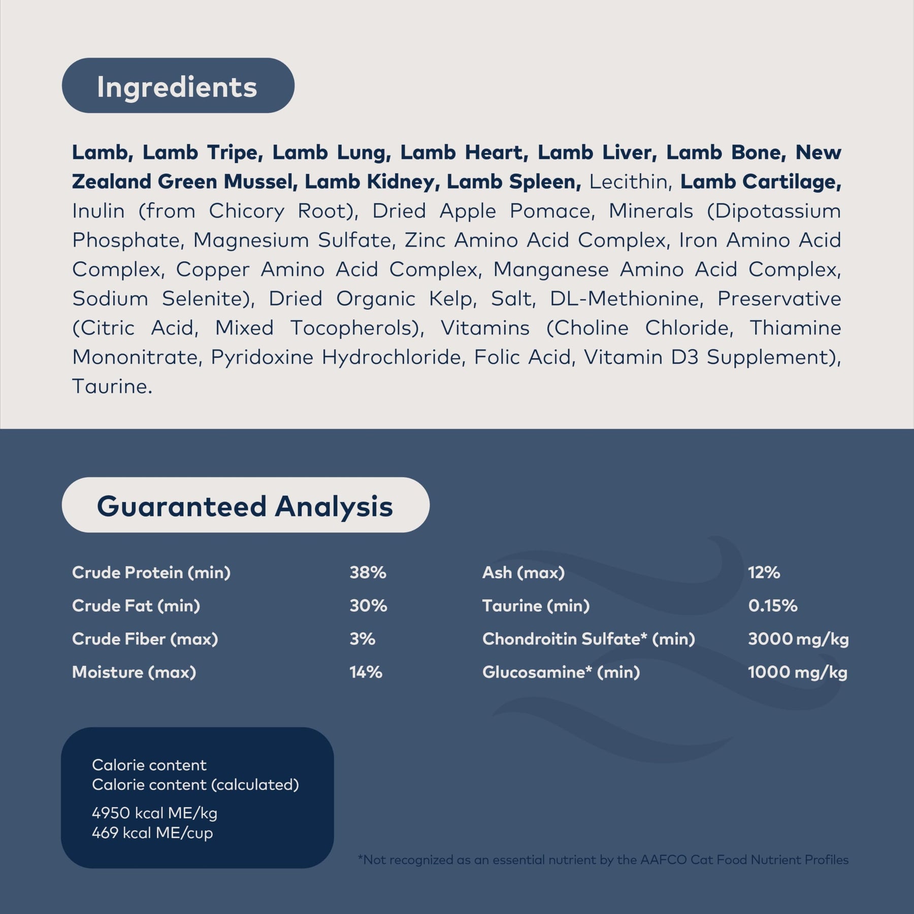 | ingredients | Lamb, Lamb Tripe, Lamb Lung, Lamb Heart, Lamb Liver, Lamb Bone, New Zealand Green Mussel, Lamb Kidney, Lamb Spleen, Lecithin, Lamb Cartilage, Inulin (from Chicory Root), Dried Apple Pomace, Minerals (Dipotassium Phosphate, Magnesium Sulfate, Zinc Amino Acid Complex, Iron Amino Acid Complex, Copper Amino Acid Complex, Manganese Amino Acid Complex, Sodium Selenite), Dried Organic Kelp, Salt, DL-Methionine, Preservative (Citric Acid, Mixed Tocopherols), Vitamins (Choline Chloride, Thiamine Mononitrate, Pyridoxine Hydrochloride, Folic Acid, Vitamin D3 Supplement), Taurine. |