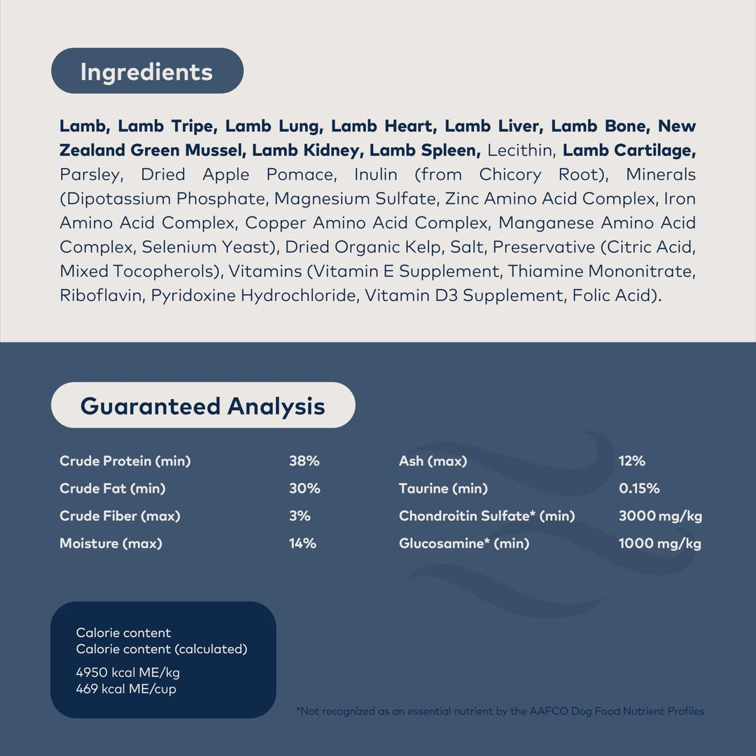 | ingredients | Lamb, Lamb Tripe, Lamb Lung, Lamb Heart, Lamb Liver, Lamb Bone, New Zealand Green Mussel, Lamb Kidney, Lamb Spleen, Lecithin, Lamb Cartilage, Parsley, Dried Apple Pomace, Inulin (from Chicory Root), Minerals (Dipotassium Phosphate, Magnesium Sulfate, Zinc Amino Acid Complex, Iron Amino Acid Complex, Copper Amino Acid Complex, Manganese Amino Acid Complex, Selenium Yeast), Dried Organic Kelp, Salt, Preservative (Citric Acid, Mixed Tocopherols), Vitamins (Vitamin E Supplement, Thiamine Mononitrate, Riboflavin, Pyridoxine Hydrochloride, Vitamin D3 Supplement, Folic Acid). |