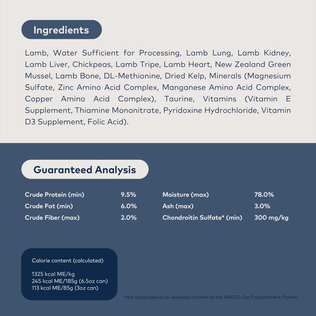 - HIGH PROTEIN, NUTRIENT DENSE, MOISTURE RICH: Featuring free-range Lamb, Organs, Bone, and New Zealand Green Mussels, this grain-free pate style cat food delivers premium nutrition with a mouth-watering taste for all cats and life stages. This moisture rich, chunky-loaf canned cat food uniquely support cat hydration.