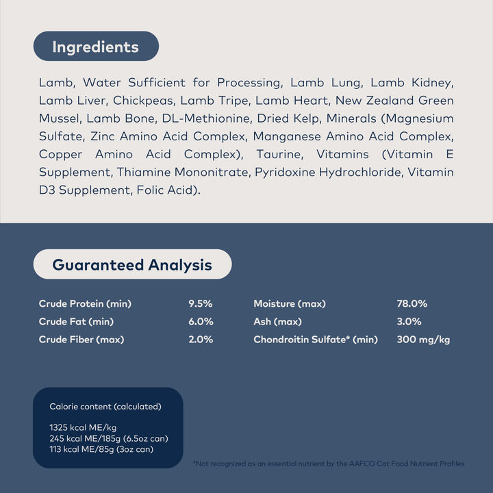 | ingredients | Lamb, Water Sufficient for Processing, Lamb Lung, Lamb Kidney, Lamb Liver, Chickpeas, Lamb Tripe, Lamb Heart, New Zealand Green Mussel, Lamb Bone, DL-Methionine, Dried Kelp, Minerals (Magnesium Sulfate, Zinc Amino Acid Complex, Manganese Amino Acid Complex, Copper Amino Acid Complex), Taurine, Vitamins (Vitamin E Supplement, Thiamine Mononitrate, Pyridoxine Hydrochloride, Vitamin D3 Supplement, Folic Acid) |