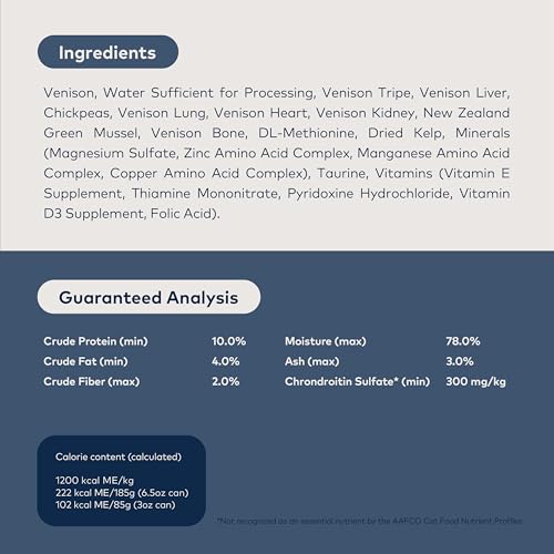 | ingredients | Venison, Water Sufficient for Processing, Venison Tripe, Venison Liver, Chickpeas, Venison Lung, Venison Heart, Venison Kidney, New Zealand Green Mussel, Venison Bone, DL-Methionine, Dried Kelp, Minerals (Magnesium Sulfate, Zinc Amino Acid Complex, Manganese Amino Acid Complex, Copper Amino Acid Complex), Taurine, Vitamins (Vitamin E Supplement, Thiamine Mononitrate, Pyridoxine Hydrochloride, Vitamin D3 Supplement, Folic Acid). |