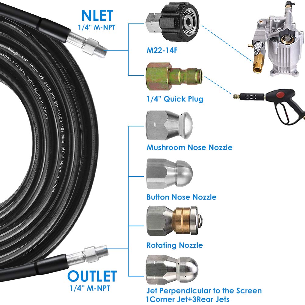 - New Family Set 6 Heads Sewer Jetter KitWe've included a variety of accessories you might use to make it easy for you to use our sewer jetting kit ! 1 × 100ft sewer jet hose,1 × button nose sewer jet nozzle, orifice 4.0,1 × M22 female to 1/4’’ female NPT coupler,1 × 1/4’’ quick connect plug,1 × rotating sewer jetter nozzle,1 × Side hole sewer jetter nozzle,1 × corner sewer nozzle.1x waterproof tape, 2xspanners, 1x box of pearl corsage pin.