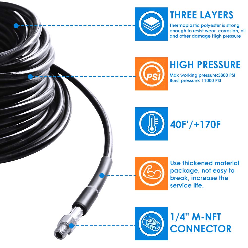 - Stronger And More Durable 5800PSIOur hoses are universal with many gas-powered and electric pressure washers up to 5800 PSI.The reinforcement layer is a chemically bonded 1/4 high strength polyester textile weave. The cover layer is made of thermoplastic polyurethane and is resistant to weather, oil, abrasion and ozone.