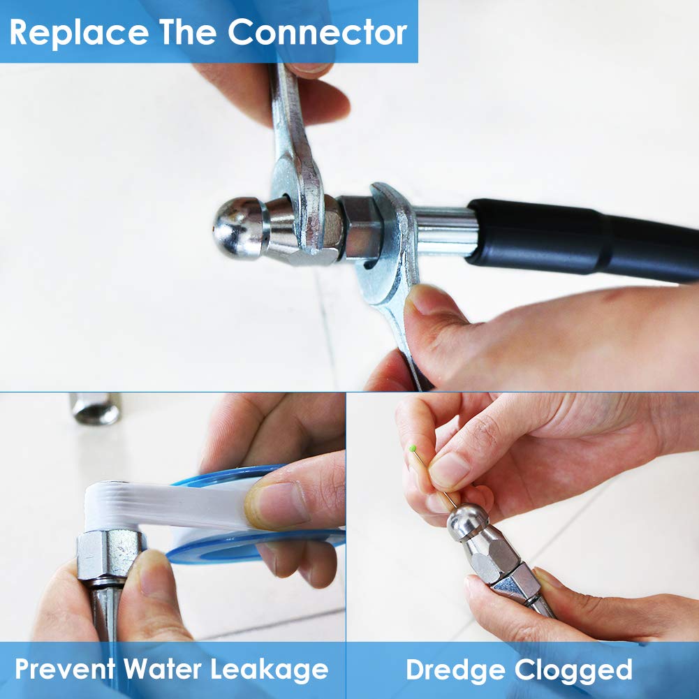 - Great For Families To Have A Set Of ToolsOur pressure washer hoses can be used to clean cars, motorcycles, floors, windows, driveways, roofs, siding, gutters, bathrooms, outdoors, indoors, etc. We added 2 wrenches to install nozzles or couplers, 1 box of pearl colored pins to help clean clogged nozzles, and waterproof tape to help prevent leaks. Easy to use once you get your hands on it!