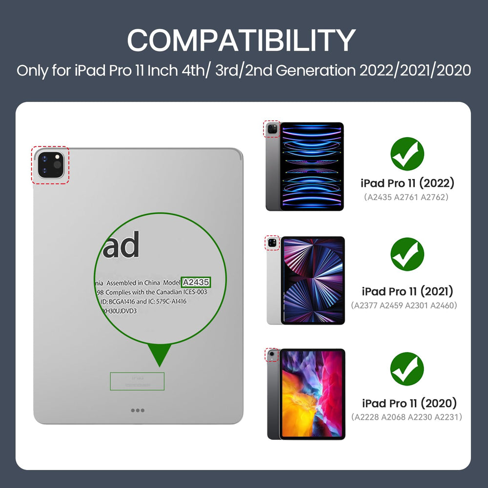 - CompatibilitySpecially designed for iPad Pro 11 Inch 4th/3rd/2nd Generation 2022/2021/2020(Model:A2435/A2761/A2301/A2377/A2459/A2228/A2068/A2230).Precise cut and design allow easy access to all ports, sensors, speakers, cameras. Note: Not fit other iPad models.
