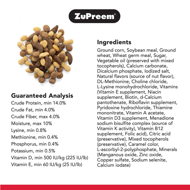 | ingredients | Ground corn, Soybean meal, Ground wheat, Wheat germ meal, Sugar, Vegetable oil (preserved with mixed tocopherols), Calcium carbonate, Dicalcium phosphate, Iodized salt, Natural flavors (source of nut flavor), DL-Methionine, Choline chloride, L-Lysine monohydrochloride, Vitamins (Vitamin E supplement, Niacin supplement, Biotin, d-Calcium pantothenate, Riboflavin supplement, Pyridoxine hydrochloride, Thiamine mononitrate, Vitamin A acetate, Vitamin D3 supplement, Menadione sodium bisulfite complex (source of Vitamin K activity), Vitamin B12 supplement, Folic acid), Citric acid (preservative), Mixed tocopherols (preservative), Caramel color, L-ascorbyl-2-polyphosphate, Minerals (Manganous oxide, Zinc oxide, Copper sulfate, Sodium selenite, Calcium iodate) |